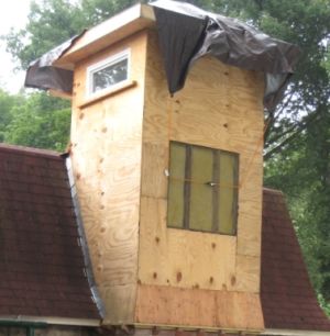 First the sheathing needed to be covered with tar paper, then with cedar shingles.